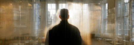 A person stands in a spacious room filled with light, creating a striking silhouette against the soft backdrop of bright, reflective walls.
