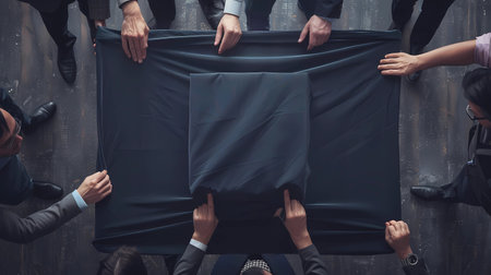 Top view of business people holding black placard with copy space.