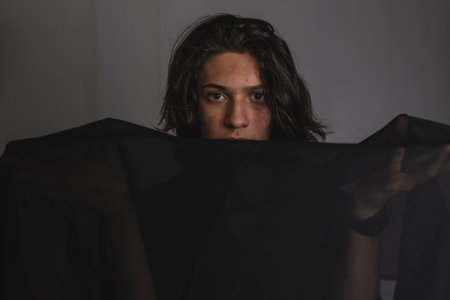 A woman is hiding behind a blanket in the dark, AI