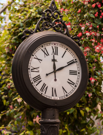 New Years vintage clock on city street. The concept of New Year and Christmas holidays. Blurred effect.