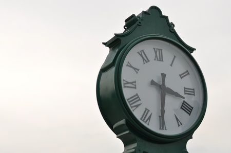 Blurred green background and close up of clock. Double exposure. Daylight Savings Time Concept.