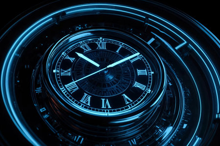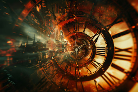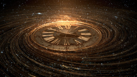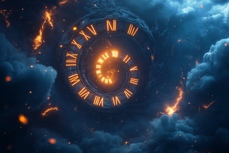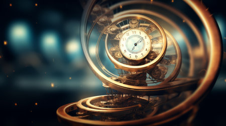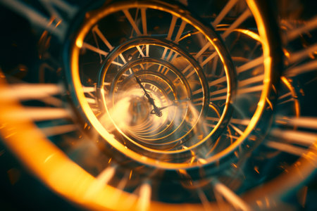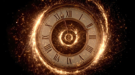 A spiraling clock design with Roman numerals emanating a warm glow, symbolizing the passage of time.