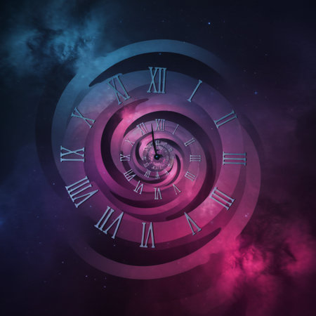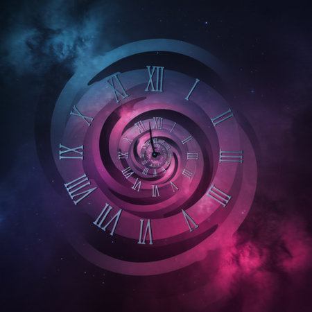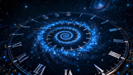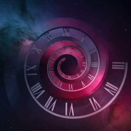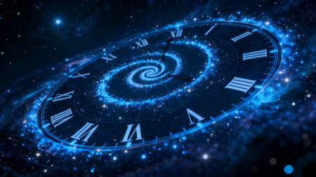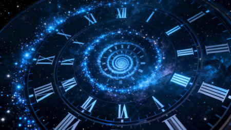 Mesmerizing spiral clock with glowing roman numerals in a dark celestial environment