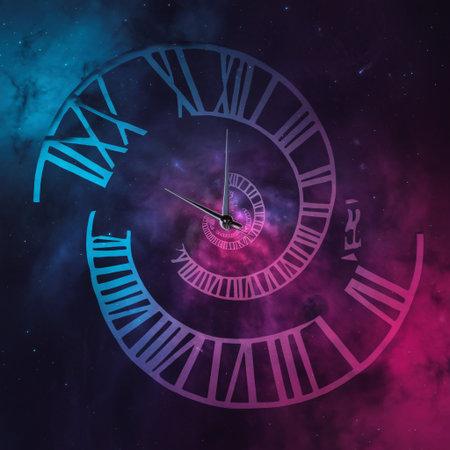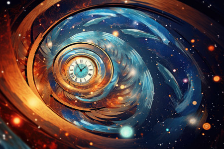 Abstract spiral clock design with cosmic backdrop, blending time and space in a vibrant color palette.