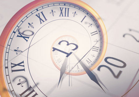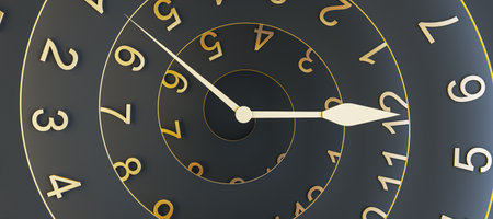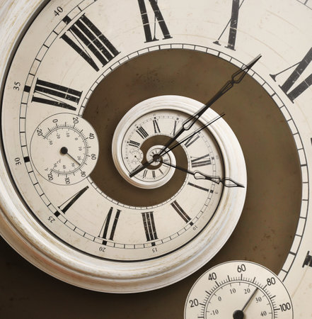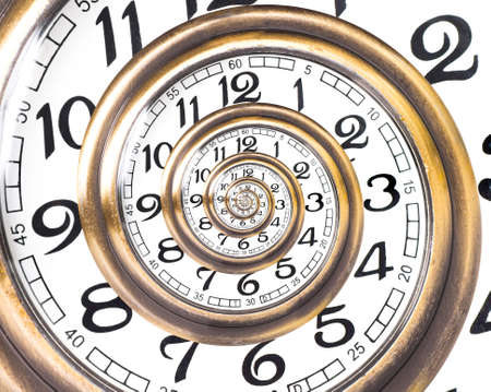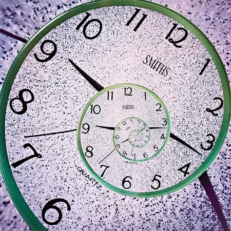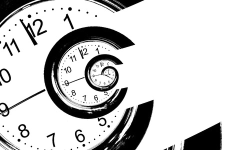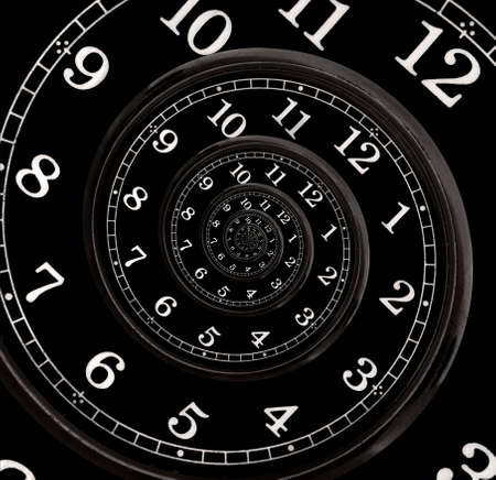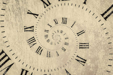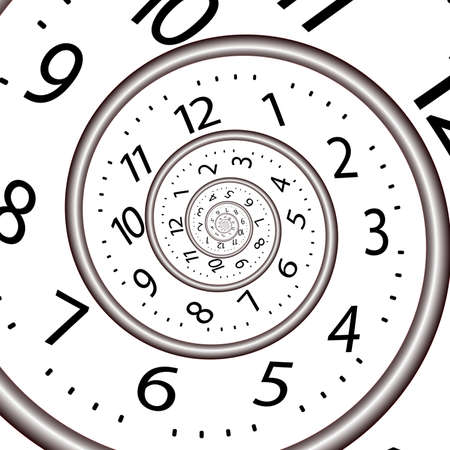 Infinity and other time related concepts. Twisted hour numbers and clock hands. Spiral fractal effect