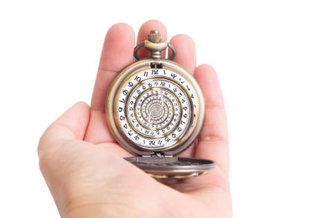 Human hand holding an antique pocket watch with a swirled watch face. Droste effect, creative time loop concept.