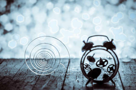 Broken alarm clock with springs and gears scattered on the background of bright light.