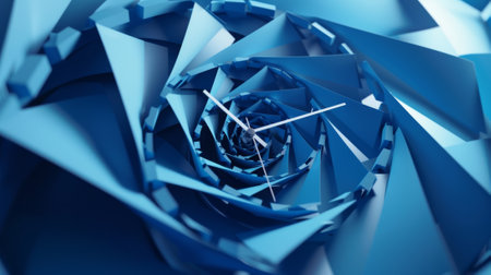 A clock with a spiral design of triangular wedges in a gradient of blues