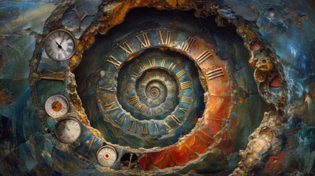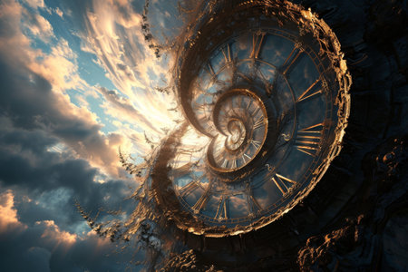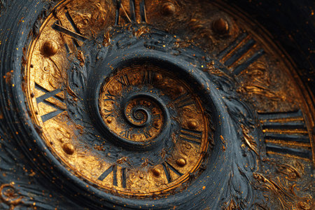 Spiral clock design with ornate golden accents and Roman numerals, highlighting the elegance of timekeeping, surrounded by textured patterns and intricate craftsmanship