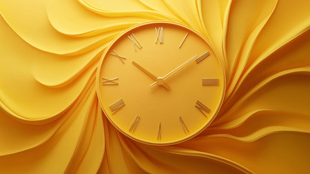 A yellow clock with roman numerals on it is set at 10:00. The clock is surrounded by a yellow wave, giving the image a playful and whimsical feel