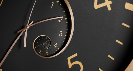 Infinity and other time related concepts, banner design. Black clock face twisted in spiral, fractal pattern