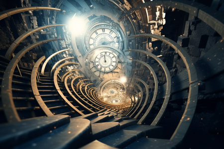 Time swirl, clock surrounded by stairs, time travel concept. High quality photo