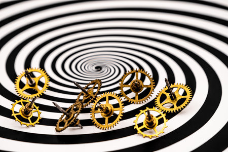 Vintage cogs gears wheels on Hypnosis visualisation conept endless spiral background