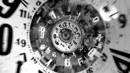 An artistic representation of time captured in a swirling motion with black and white clock numbers, creating an abstract and dynamic visual experience.