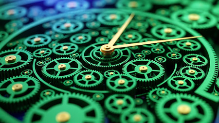 Intricate clockwork gears mechanism close-up with green and blue lighting, abstract time concept