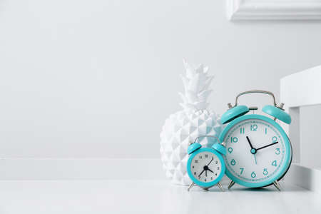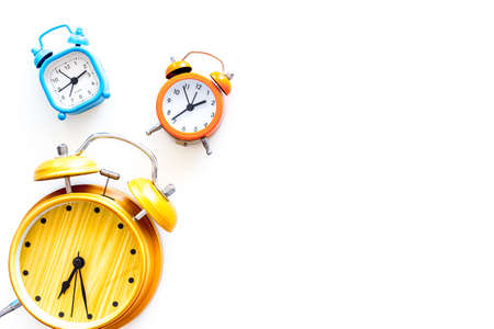 White office desk table with alarm clock. Top view with copy space, flat lay.