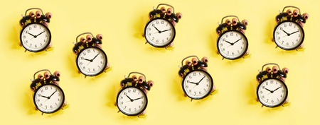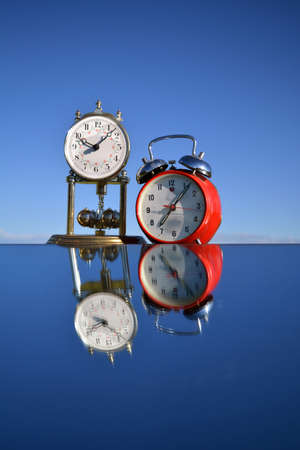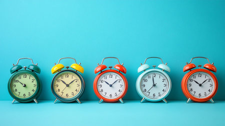 Vintage alarm clocks showing five minutes to twelve, blue background