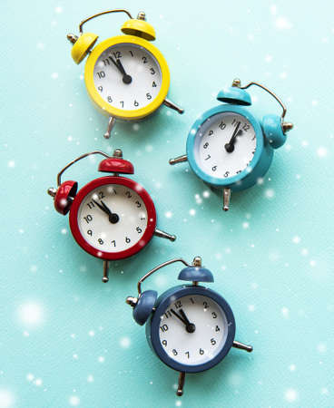 Twelve o Clock on New Years Eve of Face of Beautiful three alarm clock, indicating midnight Adorable New Year celebration Concept Happy new year 2022 background