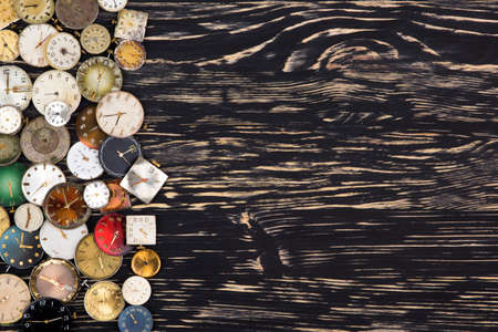Retro watchmakers workshop with spare parts and broken clocks. Old fashioned crafts.