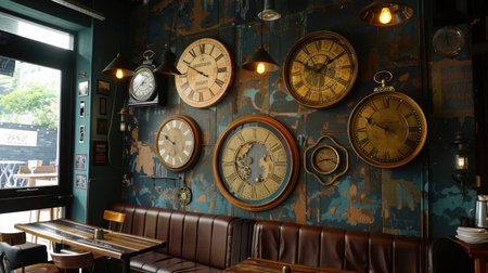 Antique clocks adorn the wall of a cozy cafe, creating a warm and inviting atmosphere. The rustic wooden furniture complements the vintage decor beautifully.