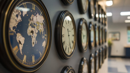 A unique wall of decorative clocks showcasing different time zones, perfect for an office environment. The clocks blend style with functionality, enhancing decor.