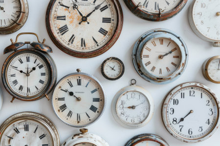 The antique clocks showing different times stand on a shelf, highlighting the concept of time and history