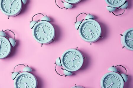 Creative layout of blue alarm clock's on pastel pink background. Minimal concept. Flat lay