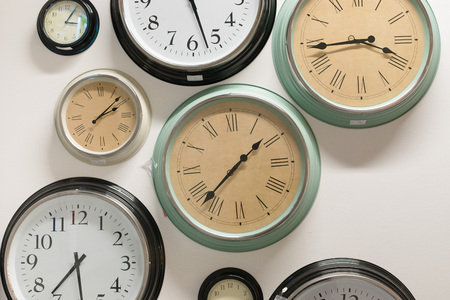 Blurred background. Selective focus. The red-edged clock is arranged in a row