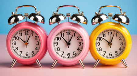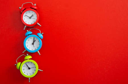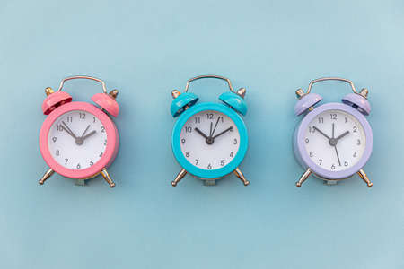 Colorful alarm clocks on blue background. Time concept. 3D Rendering