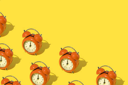 Blue alarm clock on orange background. Back to school concept. Creative design, minimal flat lay concept. Banner