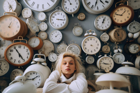 Many clocks are showing different times, creating a visual representation of stress, deadlines, and the challenges of time management in a busy schedule