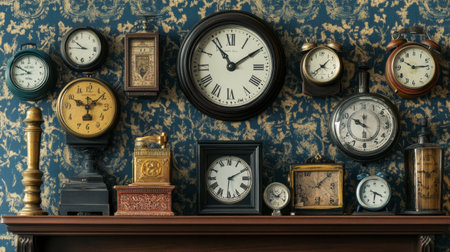 A collection of various clocks, including analog, digital, and decorative styles, arranged on a shelf against a stylish, patterned background for a dynamic visual effect.