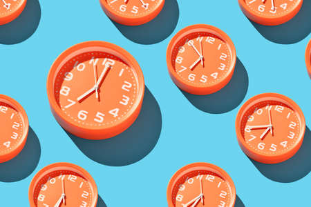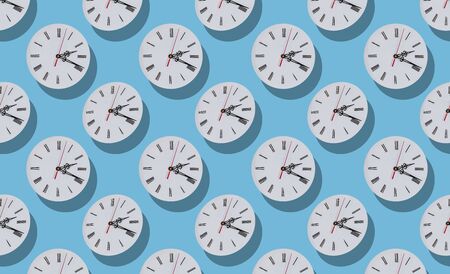 Seamless pattern with minimalistic round white wall clock on a light blue empty background. Time concept. Trendy picture.