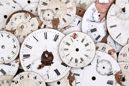 Old-fashioned clocks with Roman numerals show various times, creating a sense of timelessness and nostalgia.