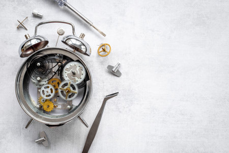 Broken alarm clock with springs and gears scattered on the background of bright light.