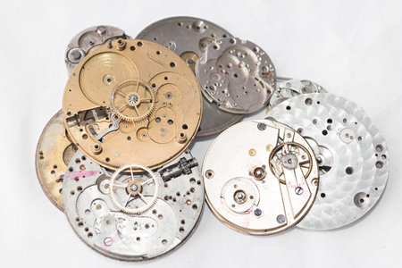 Mechanical watch assembly, watchmakers workshop with many parts and gears