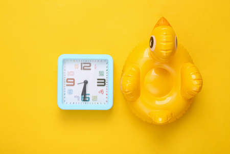 Inflatable duck with clock on a yellow background. Minimal summer concept. top view.