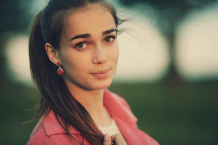 Portrait of a beautiful young girl outdoors. Outdoors portrait of beautiful young brunette woman looking at camera. Closeup sensual portrait of beautiful girl outdoors. Art photo