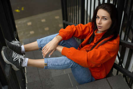Young trendy hipster woman sits on a summer staircase in a red jacket and blue jeans