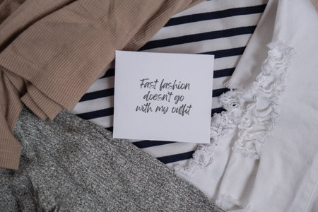 FAST FASHION DOESNT GO WITH MY OUTFIT text on paper note on clothes assortment Second hand sustainable shopping. Capsule minimal wardrobe. Sustainable fashion overconsumption, conscious buying consumption, slow fashion