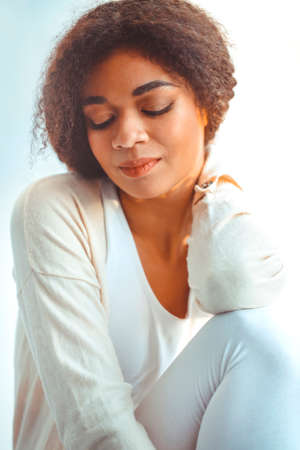 Pleased relaxed African American ethnicity girl in homewear sitting on windowsill against backdrop of curtains fluttering from light wind, happy afro female at home smiling gently with eyes closed