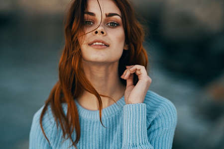 Beautiful young woman at the ocean standing against a turquoise blue sea with her hair blowing in the breeze.