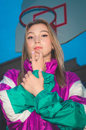 Woman wearing a vibrant retro jacket is standing on a basketball court with hands in a prayer position, under a basketball hoop, background a blue sky.