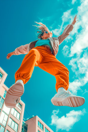 A woman in orange pants is jumping in the air. The sky is blue and there are clouds in the background