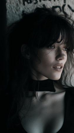 A young woman with long hair and delicate features gazes thoughtfully while leaning against a textured wall. Soft lighting highlights her profile creating shadows that enhance the atmosphere.