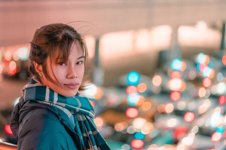 Beautiful Woman portrait in winter clothing at night at Sendai station Japan with Bokeh light of Taxi stand in the background.