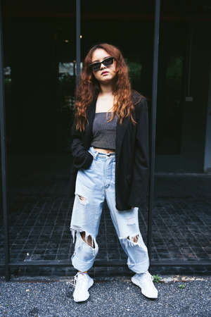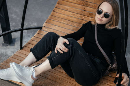 Street style. Wearing accessible pieces. Daily outfit. Developing own style. Forgoing designer labels does not have to mean sacrificing style. Fashion girl. Stylish sexy girl outdoors sky background