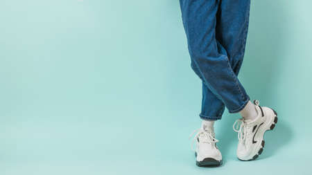 Legs of a girl in wide jeans and white sneakers on a blue background. Stylish youth clothing and shoes.