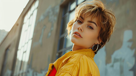 Stylish Young Woman in Yellow Jacket and Hoop Earrings Posing Outdoors Against Urban Backdrop