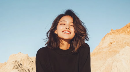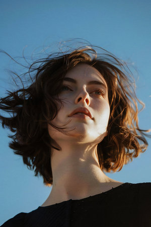 A young woman showing a relaxed expression under the blue sky
